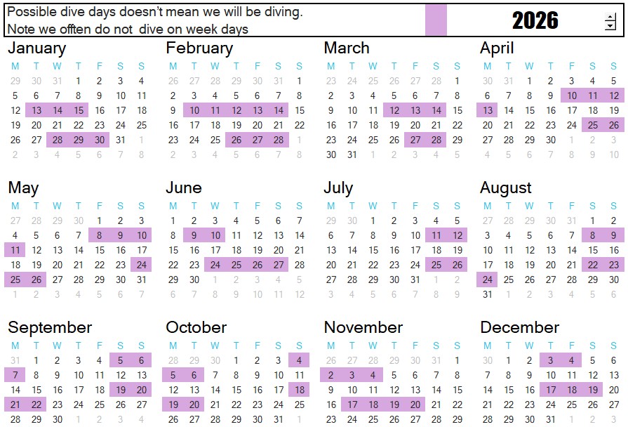 Please note: we do not often dive during weekdays. The dates shown simply indicate when conditions may be suitable for diving, not confirmed dive days.